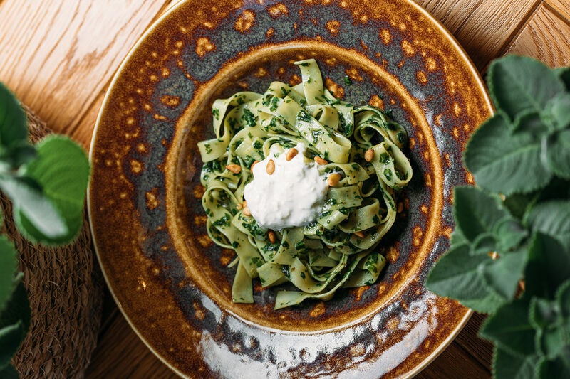 фетучини, шпинат, страчателла, кедровые орешки, песто